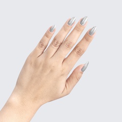 Silver. Metallic foil sparkle. Opaque. Cool undertone.